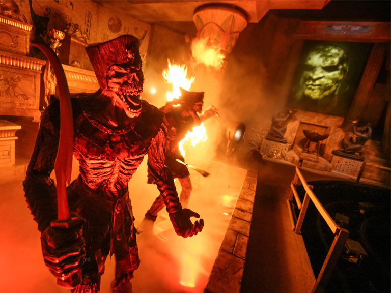 • Revenge of the Mummy ⭐️⭐️⭐️⭐️⭐️: montaña rusa bajo techo con efectos de fuego y sorpresas en la oscuridad.