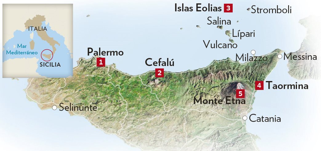 Cómo llegar y moverse: Palermo y Catania reciben vuelos directos de varias ciudades españolas y también italianas. A las islas Eolias se llega con aliscafo desde Milazzo, Messina, Palermo, Cefalú, Calabria y Nápoles. Con transbordador, desde Milazzo y Nápoles. Palermo y Catania están unidos por una autopista y un tren. Para subir al Etna se puede llegar en coche hasta el Rifugio Sapienza (Nicolosi), de donde parten a la cima el teleférico y los coches autorizados. El tren