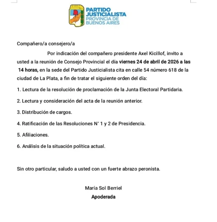 El Consejo Provincial del Partido Justicialista de la Provincia de Buenos Aires sesionará este viernes 24 de abril a las 14 horas en la sede partidaria de calle 54 N° 618 de La Plata, donde el gobernador Axel Kicillof quedará formalmente al frente de la conducción del espacio. Desde el gobierno bonaerense aclararon que no habrá acto ni movilización: se trata de una instancia estrictamente formal de proclamación de autoridades.