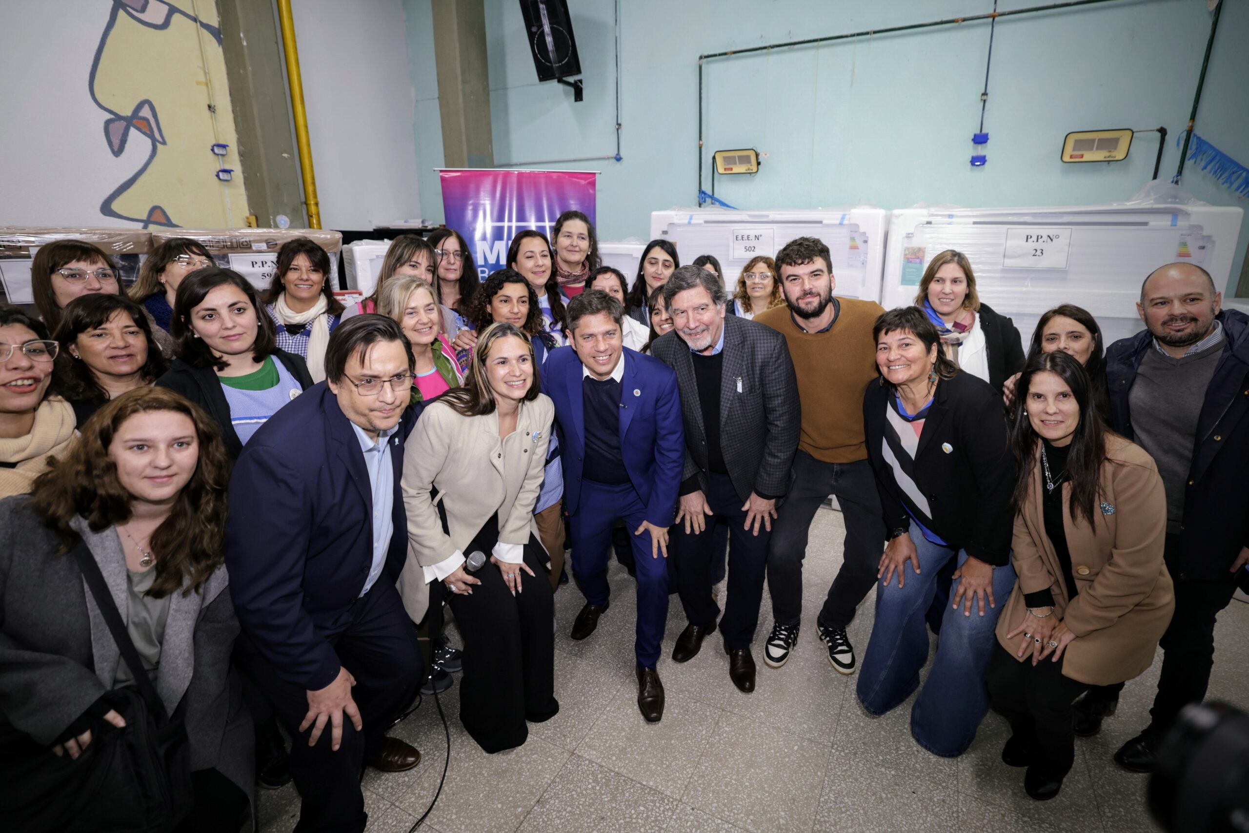 En el marco del fortalecimiento del programa de Servicio Alimentario Escolar (SAE), Kicillof y el director General de Cultura y Educación, Alberto Sileoni, realizaron la entrega de equipamiento a 34 establecimientos educativos del distrito. Contempló la distribución de cocinas, freezers, termotanques, heladeras, vajillas y utensilios de comedor.
