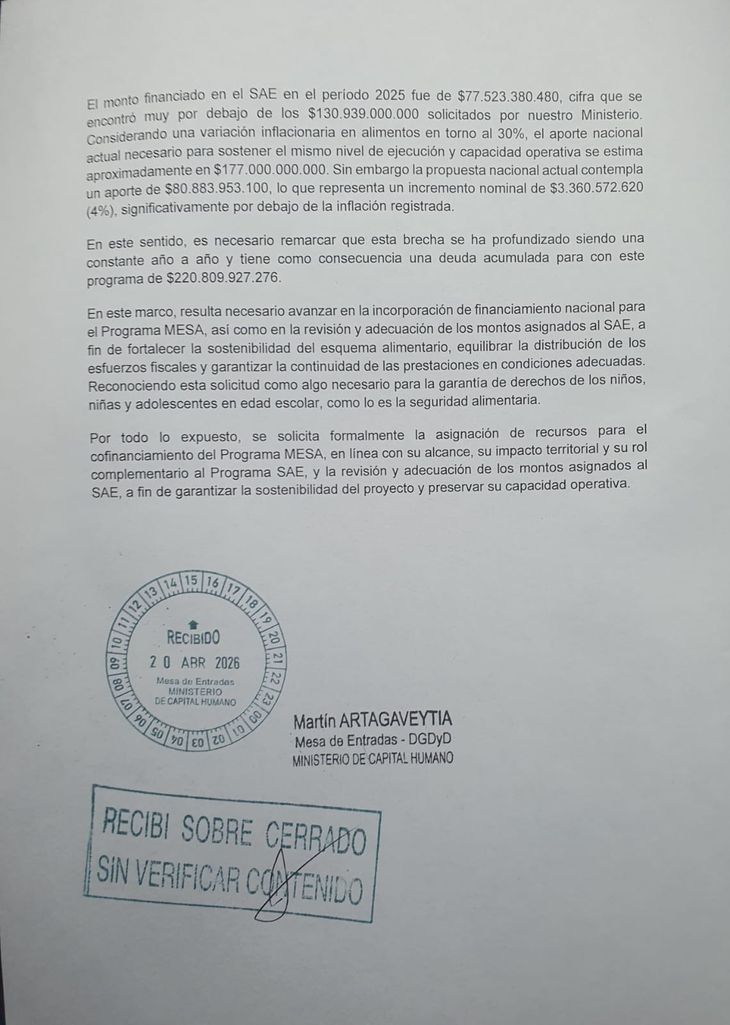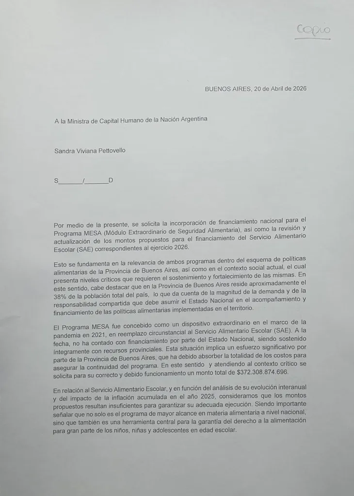 En la nota enviada a la cartera nacional –con sello de recepción del 20 de abril–, el gobierno bonaerense solicitó además la incorporación de financiamiento nacional para el Programa MESA (Módulo Extraordinario de Seguridad Alimentaria), que desde su creación durante la pandemia en 2021 fue sostenido íntegramente con recursos provinciales, sin aporte del Estado nacional. Se trata de la entrega mensual de módulos con productos secos destinados a las familias de estudiantes que asisten a escuelas públicas. Para garantizar la continuidad de ese programa, la Provincia reclamó una partida de $372.308.874.696.