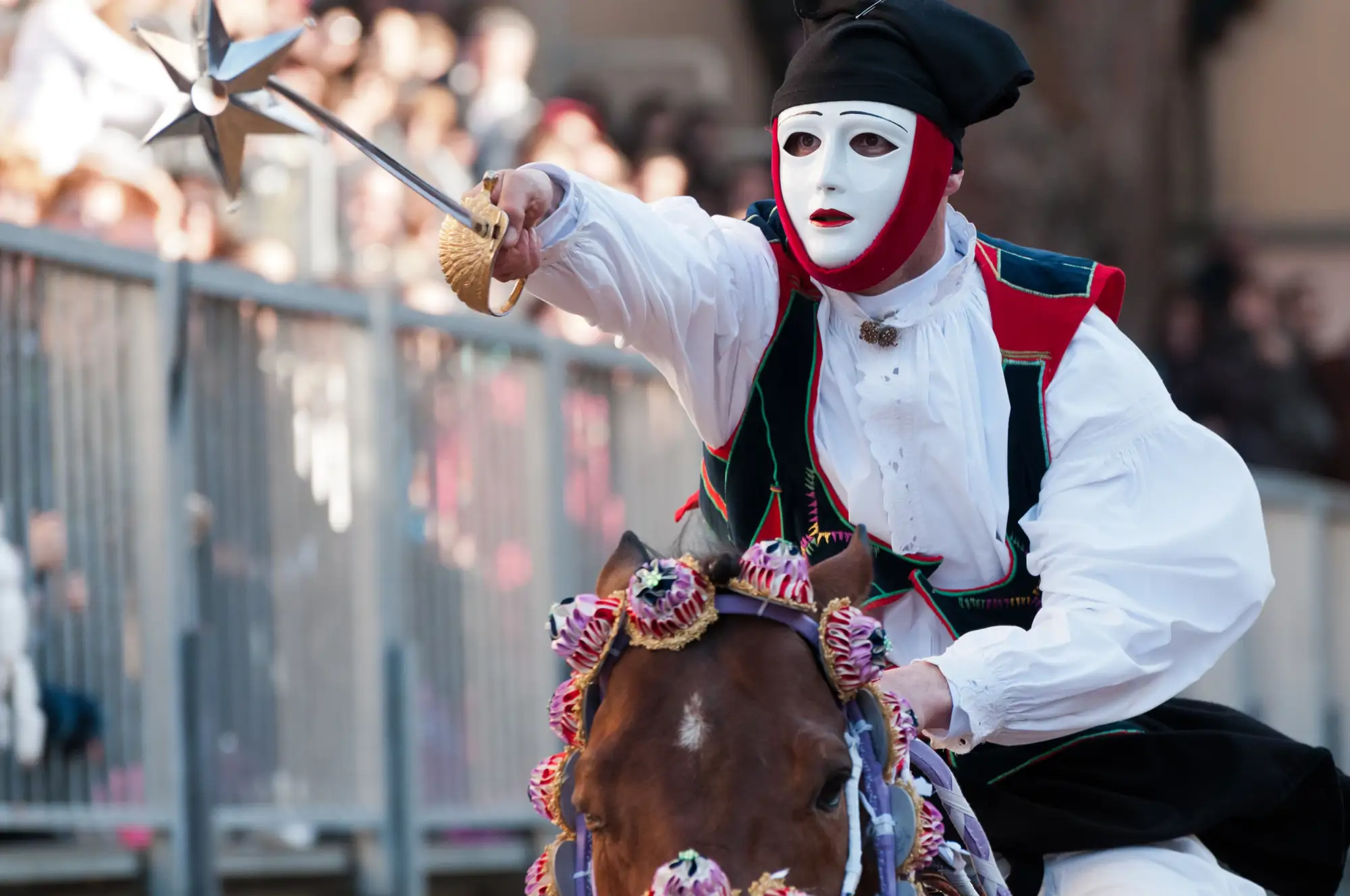 Cerdeña está llena de fiestas populares, y muchas presentan características únicas, que no se encuentran en ningún lugar de Italia. Algunas mantienen una antigua ligazón con tradiciones españolas, como la Sartiglia, que recuerda a la tradición ecuestre de Menorca, reflejo de la influencia de la Corona de Aragón en ambas islas. En la segunda semana de febrero, unos caballeros de gestos solemnes, vestidos como si estuvieran en el siglo XVI y ocultos con una máscara andrógina, se lanzan a toda velocidad a caballo y tratan de acertar, con una espada, a las estrellas de hierro colgadas en la calle.